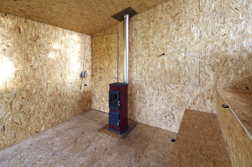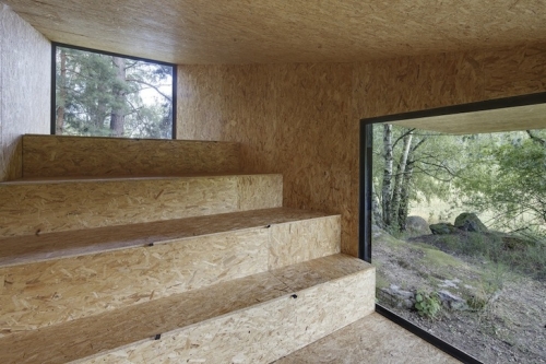 Unutrašnjost brvnare, koja meri samo 18,5 metara kvadratnih, sastoji se od jedne prostorije obložene svetlim OSB pločama. Iako mali, prostor je multifunkcionalan: velike stepenice imaju i ulogu mesta za sedenje ili spavanja i mogu biti otvoreni kako bi se u njih smestile stvari.