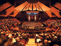 Najveća prednost "vinograd" dvorana je neposredna blizina slušalaca i orkestra, gde oni iz prvih redova sede zaista blizu muzičara i osećaju se kao deo orkestra. Istina, pojedini posetioci imaju manju preglednost nego što je to slučaj kod kutijastih dvorana. (foto: St David Hall, Kardif, Vels, 1982, 2.000 mesta). |