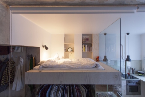 Koristeći borovu ivericu, Macova je zasnovala dizajn kuhinjske i spavaće oblasti na jednoj IKEA jedinici. Staklene ploče razdvajaju kuhinjsku/spavaću/garderobnu zonu jednu od druge, a zavese su postavljene na plafonu kako bi omogućili razdvajanje kuhinjskog i/ili spavaćeg dela od dnevne sobe. Kupatilo je smešteno pored dnevne sobe i deli unutrašnji prozor, koji takođe ima zavesu zbog privatnosti. Kupatilski pod i kuhinjski sto su napravljeni korišćenjem pigmentovane iverice.