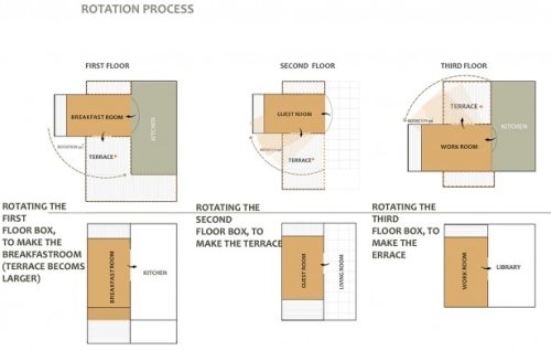 Tri pokretne sobe kuće ostaju u ravnom, ili zatvorenom položaju tokom hladnog vremena. Međutim, kada se sunce pomoli, svaka soba se može zarotirati za 90 stepeni ka spolja pritiskom na dugme, otkrivajući poprilično obimnu terasu. Kada se kuća nalazi u svom „otvorenom“ stanju, dodatna prirodna ventilacija i svetlost je bonus za ukućane.
