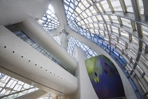 Umotana u niz metalnih orebrenih latica, sa eksterijerom i enterijerom koji su obloženi sa mozaik pločicama koje stvaraju nesmetan gradijent boje od bele, preko bež do tamno roze. Ogromni luster dugačak sedam metara visi sa plafona u centru objekta poput tučka cveta.