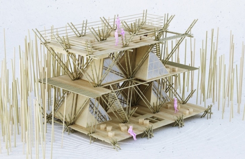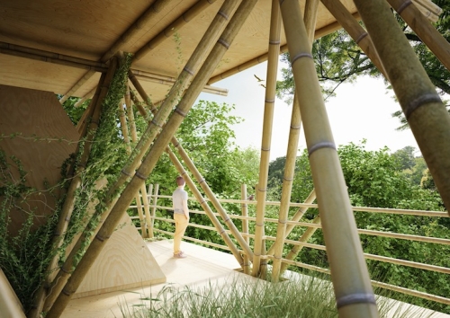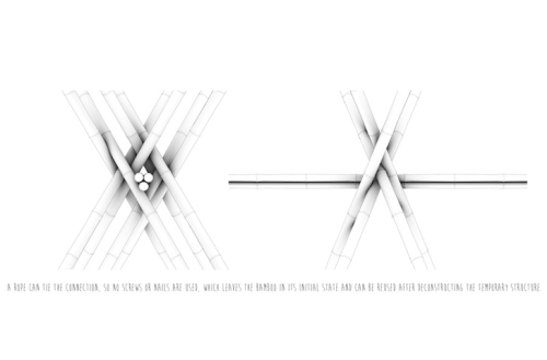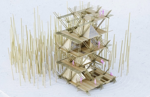 Kako bi zadovoljio kriterijume takmičenja, biro Penda je koristio brzo-rastući bambus lokalnog porekla kao glavni građevinski materijal. Privremena i izdignuta struktura od bambusa je inspirisana minimalističkim šatorima nomadskih plemena Indijanaca, te izbegava korišćenje šrafova i eksera.