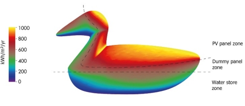 Prekrivena sa fotonaponskim panelima, energetska patka je dizajnirana da sakuplja solarnu energiju na svakom pedlju svoje spoljašnje ljuske, a takođe koristi i sunčeve zrake koji se odbijaju od površinu vode. Pored toga, objekat poseduje hidro turbine koje koriste pritisak vode za obezbeđivanje uskladištene energije posle zalaska sunca i tokom večeri.