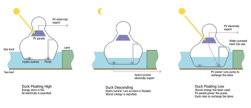 „Kada uskladištena energija treba da se isporuči, patka se potapa preko jedne ili više hidroturbina za proizvodnju električne energije, koja se prenosi na nacionalnu mrežu istim putem kao i struja generisana od strane fotonoponskih panela“, rekao je tim dizajnera.