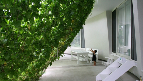 Arhitektonski biro Hideo Kumaki Architect je projektovao ovu zelenu zavesu koji štiti unutrašnjost objekta u toku letnjih dana i stvaranje zaštićene trpezarije spolja.