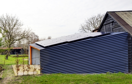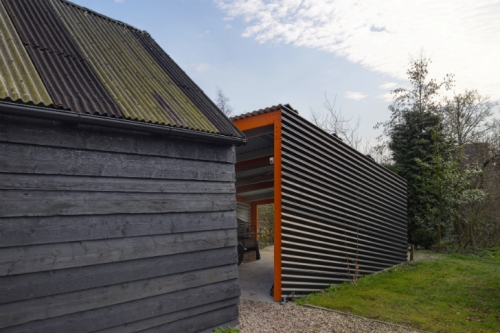 Oni su se odlučili za konstruktivni drveni ram prekriven sa metalnim panelim kako bi stvroili zaštićeni prostor kome se može pristupti ili preko malog otvora u blizini štale ili preko velikog otvora na suprotnom kraju. Krov je optimalno nagnut kako bi se povećala proizvodnja solarne energije tokom cele godine. Rezultat je šupa koja je savremena, a ipak deluje kao da je oduvek tu.
