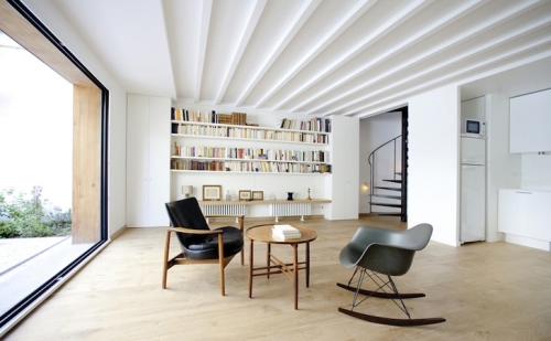 Beli enterijer stvara iluziju prostornosti sa velikim zastakljenim prozorima i otvorenom dnevnom sobom i trpezarijom na prvom spratu. Ugradne police i izložene plafonske grede dodaju na osećaju dubine u prostorijama, dok drveni pod i drugi drveni akcenti prožimaju prostor sa osećajem topline.