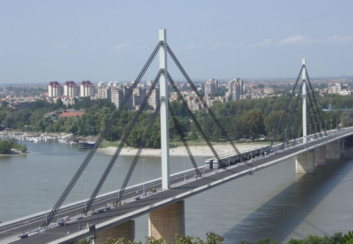 Projektanti mosta su bili akademik Nikola Hajdin, Gojko Nenadić i Predrag Želalić, a glavni izvođač radova je bila „Mostogradnja“ iz Beograda. Pored domaćih firmi, angažovane su i strane kompanije, „Ganz-Mavag“ iz Budimpešte bila je zadužena za isporuku gornje čelične konstrukcije i dva pilona, „Stahlton AG“ iz Ciriha je izradila kose čelične užadi i „Gutehoffnungshutte Sterkrade AG” specijalna ležišta.