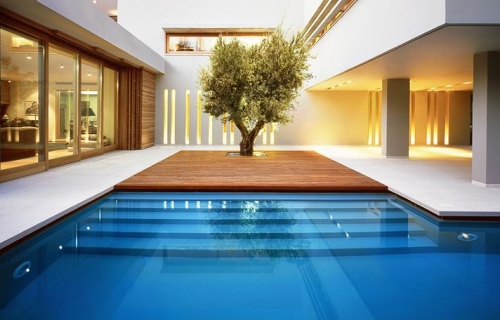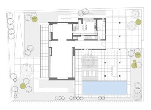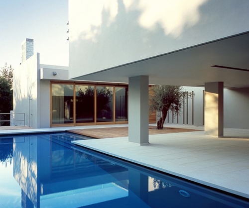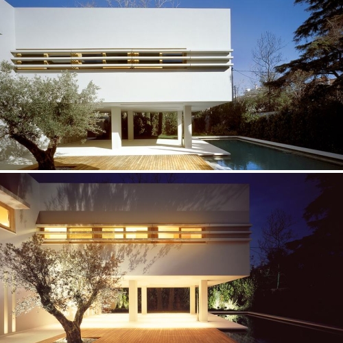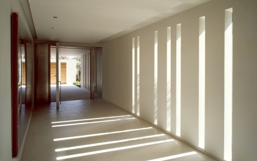 Rasveta unutar hodnika je dramatična, a geometrija jednostavna i nekako asketska, materijali variraju od belutaka do uzoraka drveta. Konačno – unutrašnji otvori naglašavaju odnos koji kuća uspostavlja sa okruženjem, baš kao što se i atrijumom u centru prostor uvećava ka gornjim etažama. Njemu (atrijumu) pridodat je i bazen, neke natkrivene zone, kao i zelenilo, sve da bi se unapredio kvalitet života i dnevna dinamika u ovom domu.