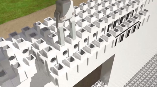 Modularni blokovi se uklapaju skoro isto kao i Lego kockice sa dodatkom posebnog lepka. Redovi udubljenja na dnu cigle se umeću na vrhu drugih cigli, dok se čelične šipke provlače kroz kanale u ciglama što celi zid čini ekstremno jakim. Zahvaljujući sistemu nalik Lego kockicama, ovaj metod izgradnje je zasnovan na standardizovanim elementima za skoro svaku građevinsku komponentu, uključujući vrata, prozore, vodovod i kanalizaciju, itd.