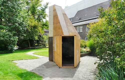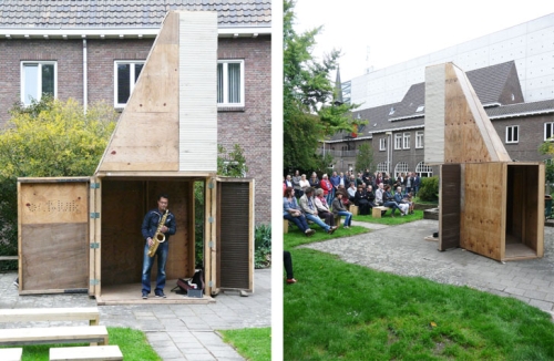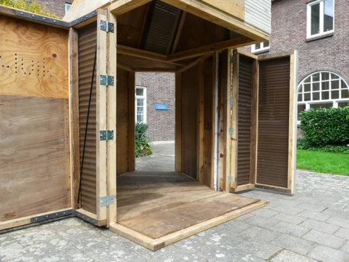 Projektantski duo Vullings de Moor je stvorio ovo interesantno reciklirano sklonište korišćenjem metalnih žaluzina pronađenih širom ulica grada Herlena na jugu Holandije. „Ont-luik“ je mala struktura nalik paviljonu izgrađena od ponovo upotrebljenih drvenih greda pokrivenih sa starim roletnama i otpadnim građevinskim materijalima.