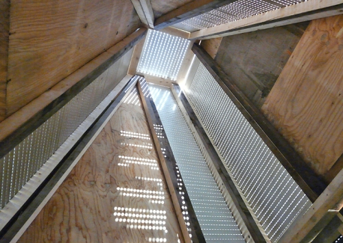 Umesto da koriste nove materijale, oni su se opredelili za ponovo korišćenje starog drveta i odbačenih roletni i izgradili malu zgradu koja može da promeni svoju konfiguraciju u zavisnosti od željenog nivoa intimnosti i prirodnog osvetljenja.