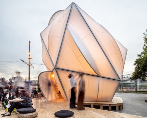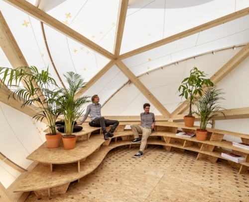 Izgrađen od OSB ploča i platna, paviljon je prefabrikovan za samo pet dana i sklopljen za četiri. Unutra, perforirani drveni pod podstiče protok vazduha, a podignuta konturna sedišta čine prostor pogodnim za društvena okupljanja.