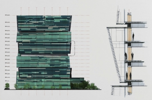 Šumarska kula se sastoji od niza trospratnih pravougaonih volumena, svaki sa završnim zidom pod uglom i blago pomernim ukupnim volumenom u odnosu na niže nivoe kako bi se njima obezbedilo obilje prirodne svetlosti i ventilacije. Raspoređeni u obliku naslaganih drva, glavna kula zgrade obuhvata dva naslagana volumena koji aludiraju na rad kineskih poljoprivrednika „koji obrađuju zemlju, gaji i seku drva, skupljaju i slažu proizvode kako bi doneli red i harmoniju u zajednicu“.