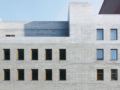 Pažljivo dizajnirane obrasci na oplati za uličnu fasadu i unutrašnje izložene betonske zidove odlikuju borove daske oko 20cm široke koje su precizno pozicionirane. Pomni nadzor nad sipanjem i vibracijom betona je pomogao u proizvodnji glatkih, izjednačenih površina. Štaviše, svaki sprat je završen u jednom izlivanju, a zidovi su završeni malo više nego podna ploča, tako da se spojevi uklapaju tačno sa onim između dasaka oplate.
