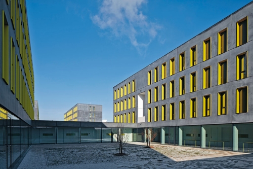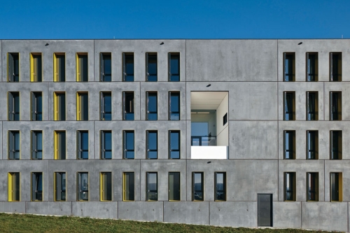 Prefabrikacija i stroga raspored su ishod fiksnog budžeta, u iznosu od oko 17 miliona evra za oba stambena bloka. Za razliku od unutrašnje betonske strukture, noseći spoljašnji zidovi se sastoje od prefabrikovanih betonskih sendvič elemenata. Glatki, vodoodbojni sloj ima mutnu, prošaranu površinu.