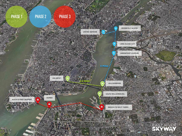 Ukoliko projekat bude usvojen, prva faza bi podrazumevala povezivanje priobalnih oblast u Vilijamsburgu sa Menhetnom, kao i Južnog Vilijamsburga sa brodogradilištem u Bruklinu. Dalje faze još nisu definisane ali bi mogle da sadrže proširenje sistema gondola ka severu do Long Ajledna i južno do luke Saut Strit.