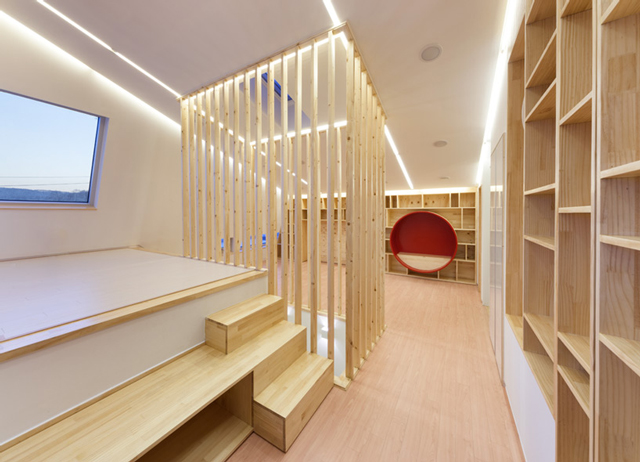 Arhitektonski biro Moon Hoon je takođe ugradio nekoliko razigranih elemenata u unutrašnjosti, kao što je recimo klizna polica za knjige koja služi i kao tajni ulaz i tobogan između dva sprata.