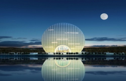 Hotel je projektovan od strane arhitektonskog biroa Shanghai Huadu Architect Design, a „izlazeće sunce“ se može videti na prednjoj fasadi. Iz ove persepktive, hotel je kružnog oblika i izdiže se 97 metara iznad zemlje na dvadeset i jednom spratu. Sveukupno, on je zapravo više u obliku diska koji deluje kao da je delimično ukopan u zemlju.