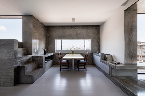 Arhitekta Kimura je dodao ugrađene elemente nameštaja u enterijeru. Širom dvospratne kuće, police, stolovi i mesta za sedenje izranjaju u harmoničnoj paleti crne, bele i sive boje. Ovi ugrađeni elementi mogu da se koriste za skladištenje ili sedenje, pružajući porodici fleksibilnost tokom vremena.