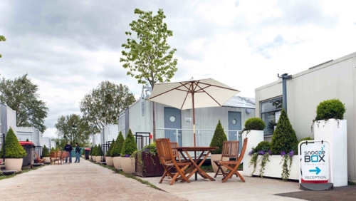 Događaji poput Olimpijskih igara stvaraju veliku i iznenadnu potražnju za hotelskim smeštajem - što čini kontejnerski hotel „Snoozebox“ genijalnom idejom. Složive hotelske sobe od transportnih kontejnera mogu da budu postavljene skoro bilo gde, pružajući udobnost smeštaja za tili čas. Karavanski hotel je bio postavljen u Londonu 2012. godine radi smeštaja pripadnika obezbeđenja Olimpijade.