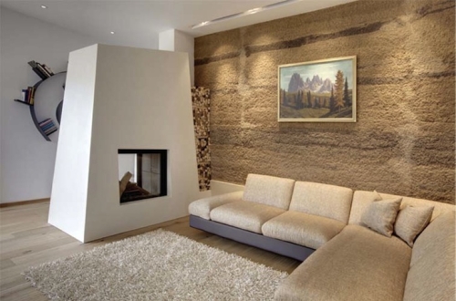 U oštrom kontrastu sa drvenim eksterijerom, moderni enterijer je obložen sa teksturisanim krečnjačkim agregatom, materijalom koji apsorbuje vlagu i koji može da ohladi unutrašnjost kuće tokom vrelih letnjih meseci.