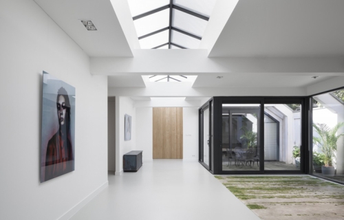 Unutrašnje dvorište se nalazi između dnevne sobe i glavne spavaće sobe. Kako bi pružili čvršću vezu između enterijera i eksterijera, arhitekte su dizajnirali ručno tkani tepih od 20 metara kvadratnih koji ima šaru nalik mahovini.