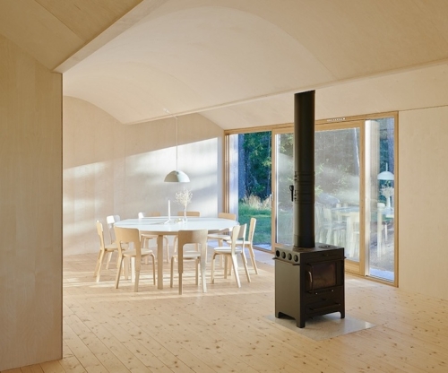 Za razliku od tamne metalne fasade, enterijer je obložen sa svetlim drvetom. Table šperploče su savijene tako da se stvara zanimljiv zasvođeni efekat na plafonu u prizemlju. Na prvom spratu se proteže svetlarnik duž slemena krova kako bi omogućio prodor prirodne svetlosti u prostor i radi naglašavanja vertikalnosti u spavaćim sobama.