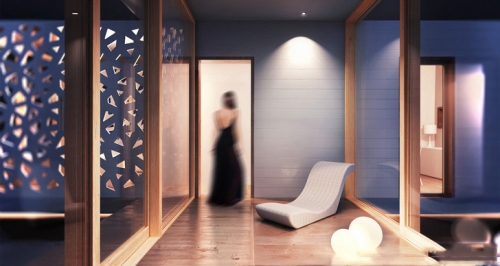 Kuća takođe ima jasnu podelu između dnevnih i spavaćih delova sa zastakljenim hodnikom/ulazom u sredini koji omogućava stanarima da ponovo uspostave kontakt sa okolinom (protokom vremena) prilikom svakog prolaska.