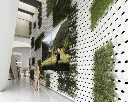 Unutar paviljona su smešteni obrazovni i interaktivni sadržaji. Dizajn enterijera takođe na kreativan način uvlači organske elemente unutra, poput ekrana za projekciju koji je integrisan u živi zid i desetine elektronskih ekrana koji su obešeni na plafonu i prikazuju slike neba.