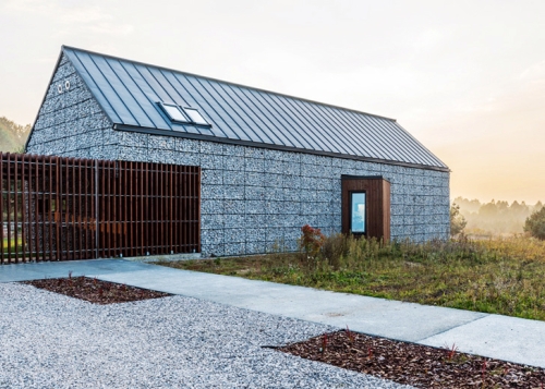 Ova porodična kuća u Poljskoj je napravljena od gabionskih korpi napunjenih sa lokalnim krečnjakom. Izborom istog materijala koji je nekada korišćen za izgardnju dvoraca i crkava na ovom području, arhitekte u birou Kropka Studio su spojili rustičan dojam krečnjaka sa savremenom tehnologijom gradnje. Ova kamena fasada je isplativa i trajna i prikazuje peotsku lepotu održive gradnje.