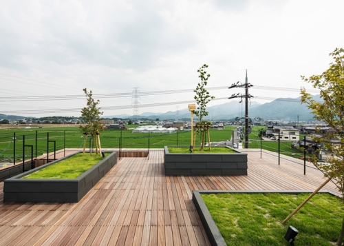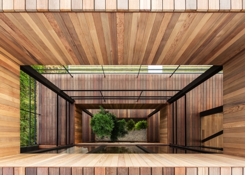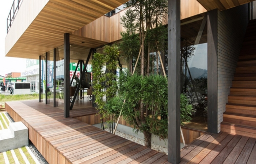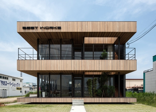 Ovaj sofisticirani salon lepote i kancelarijska zgrada obložena kedrovinom u Japanu se obavija oko zelenila koje se penje sa njegove unutrašnje strane, dostižući visunu plafona prvog sprata, odakle je zelenilo vidljivo sa krovne bašte.