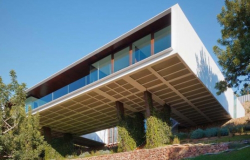 BF kuća na brdu je projektovana da ima minimalan uticaj na svoju okolinu. Odabirom prefabrikovanog sistema gradnje, arhitekte iz biroa Office of Architecture in Barcelona (OAB) su uspele da izbegnu seču postojećih drveća i ostavili netaknutom terasastu konfiguraciju parcele. Cela struktura počiva na tri metalna stuba u obliku slova V i deluje kao da lebdi u vazduhu, pružajući veličanstvene poglede na Kastelon pokrajinu u Španiji.