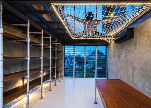Trospratna kuća takođe uključuje jedinstvene prostore kao što je mesto za odmor nalik paukovoj mreži koja je obešena u vazduhu i opuštajuća krovna vertikalna bašta i terasa koja se može pohvaliti sa panoramskim pogledom na obrise Bangkoka.