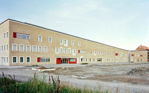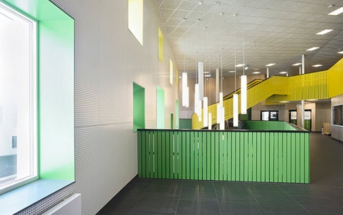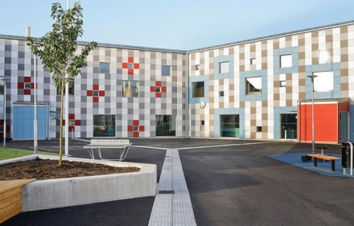 Šarena vlakno-cementno obloga prekriva fasadu školskog dvorišta sa vitalnim, razigranim šablonom. Kao novo srce škole, igralište ne samo da pruža vezu između novih i starih zgrada, već i pruža kreativno otvoreno okruženje za učenike i nastavnike.
