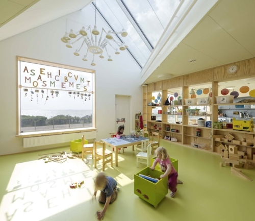 Unutrašnjost vrtića je projektovana da ostane svetla i prozračna sa belim zidovima i svetlo zelenim podovima, koji je upotpunjen sa podelama od „zida-police za knjige“ napravljene od šperploče.