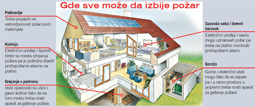 Požar mogu da izazovu mnogobrojni kuhinjski aparati i šporet. Vrlo često zbog pare koja se tokom kuvanja oslobađa dolazi do lažne uzbune. Zbog toga je bolja alternativa protivpožarni alarm koji reaguje na toplotu, a ne na dim, te je otporan na prljavštinu, prašinu i paru. Ako temperatura u prostoriji naraste iznad 60o C, alarm se pali. U potkrovlju posebno treba da se vodi računa o vrsti izolacije i njenoj otpornosti na požar. Podela u toj kategoriji obuhvata materijale od nezapaljivih pa do zapaljivih. Koliko je neki materijal zapaljiv prosuđuje se preko njegove vatrootpornosti.