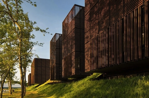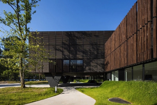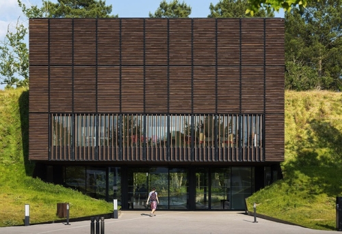 Namesto monolitne mase, arhitekte su razbile zgradu u niz kutijastih volumena koji konzolno štrče preko ulazne putanje. Svaka drvena kutija je okružena sa velikim delom travnate rampe, koja vizuelno spaja zgradu sa šumskim pejzažom i pruža zaštitu od jakih vetrova i solarne toplotne dobiti.