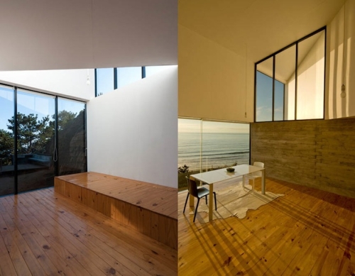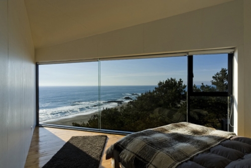 Zbog zakošene geometrije kuće, predivni pogledi na okean i obližnju šumu se pružaju u svakoj sobi. Prizemlje poseduje dnevni boravak, trpezariju i kuhinju, kao i malu spavaću sobu.