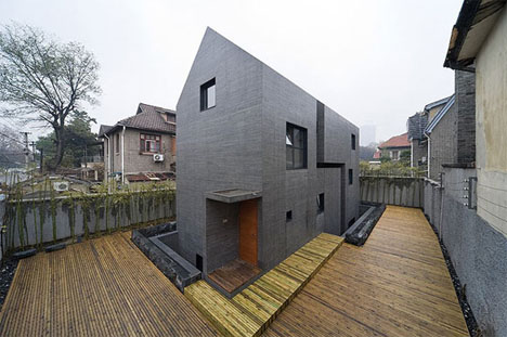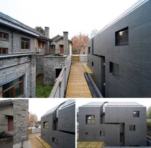Unutar granica kompleksa koji okružuju strukturu, parcela, to jest dvorište je takođe izuzetno moderno uređeno sa repetitivnim drvetom postavljenim u dva tona - što je direktan kontrast vertikalnim zidovima same kuće.