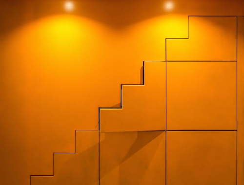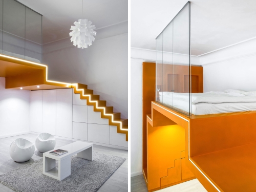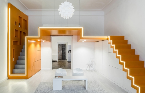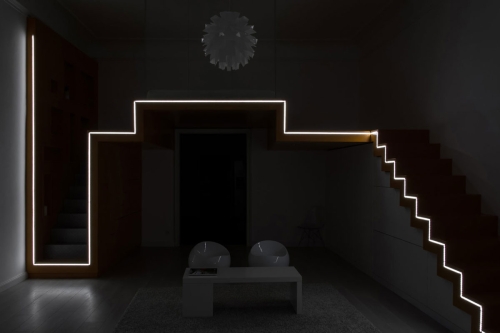 Celokupan narandžasti sklop stepenica je istakanut sa trakom svetla koji se proteže preko ivice. Noću, to trakasto osvetljenje osvetljava stan u geometrijskom uzorku koji oponaša oštre uglove ostatka prostora.
