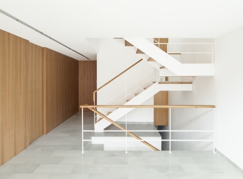 Enterijer uske kuće u Barseloni je većinom okrečen u belu boju kako bi se što više smanjila potreba za veštačkim osvetljenjem, i on je upotpunjen sa lepo urađenim drvenim akcentima i kamenim pločicama. Stepenište sa otvorenim drvenim gazištima spaja četiri nivoa kuće.