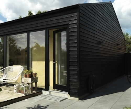 Kutijasti eksterijer doma je obojen u crnu boju i ukrašen sa krovom koji daje zgradi moderan i šik izgled. Nasuprot tome, enterijer ima svetliju paletu boja, a glavni podeoni zid od šperploče je ostavljen neobojen. Kuća je projektovana da smesti tročlanu porodicu.
