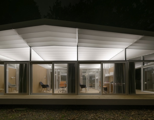 Zastakljena fasada se nalazi iznad povišene platforme od hrasta i čelika koja stvara kontinuirani trem oko paviljona. LED osvetljenje je postavljeno na vrhu podeonih zidova studijskog prostora.