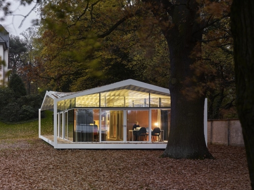 Transparetni paviljon je opremljen sa staklenim kliznim vratima na sve četiri strane, koja otvaraju do šest učionica od po sedam kvadratnih metara, veći prostor za učenje i kuhinjski prostor.