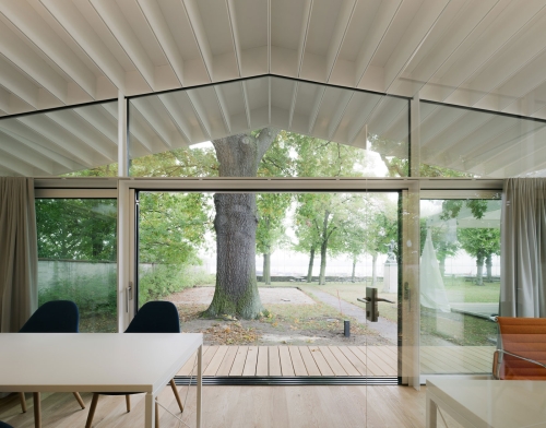 Sam krov paviljona je čelika postavljenim pod uglom, dok je struktura obmotana u staklenu fasadu koja daje paviljonu lagani utisak i otvara enterijer prirodi i svetlu. Zgrada se takođe može pohvaliti sa energetski efikasnim dizajnom koji ima trostruko zastakljenje, zidno grejanje preko toplotne pumpe i visoko-kvalitetnu izolaciju.