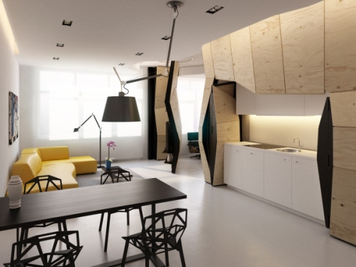 Sa šezdeset kvadratnih metara prostora sa kojim je morao da rukuje, ruski arhitekta Vlad Mišin je projektovao Transformerski stan koji sadrži nekoliko elemenata koji se mogu transformisati. Stan je odvojen po dužini sa masivnom, višestrukom zidnom strukturom koja je napravljena od ramovske konstrukcije od crnog metala i šperploče koji krije različite funkcije u domaćinstvu.