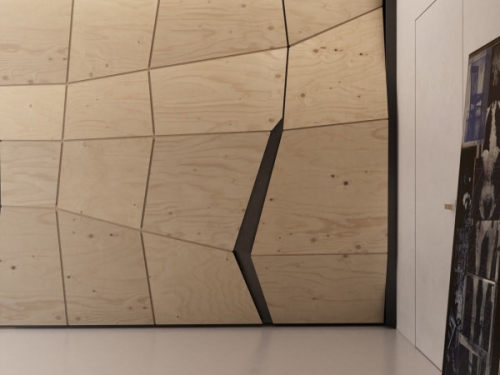 Vrata ka kupatilu su sakrivena u transformabilnom zidu od čelika i šperploče.