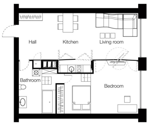 Veći deo transformabilnog zida otkriva skrivenu kuhinju koja se nalazi iza zglobnog pregradnog zida. Pomerite panele u stranu, sklonite ih i imate kuhinju koja po veličini i opremljenosti odgovara potrebama modernog stana.