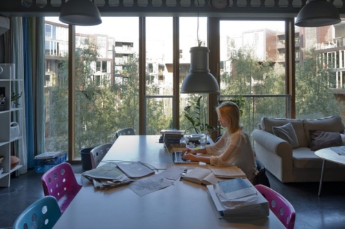 Unutar studenjaka, izloženi beton i pod od magnezijuma čine velike prostore izuzetno izdržljivim i lakim za održavanje, dok paneli od ekološka brezine šperploča dele manje sobe. Izabrani materijali takođe pomažu u izolovanju zajedničkih prostorija studenjaka. Studenti vole svetlo obojene zavese, mašine za pranje rublja i poštanske sandučiće koje savršeno povezuju sirove, prirodne materijale koje ih okružuju.